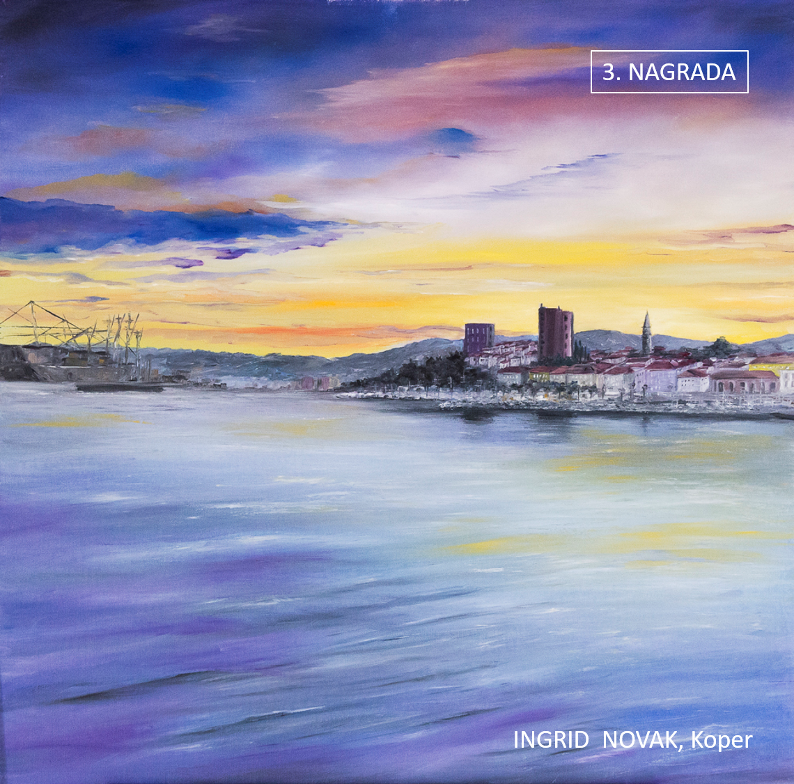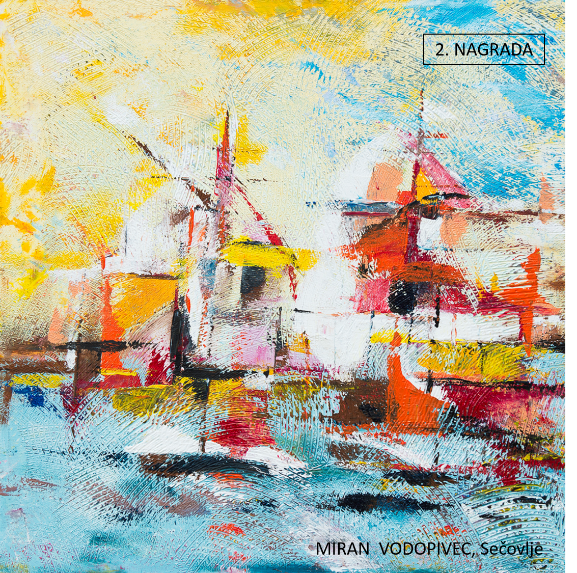 Druga nagrada je razveselila Mirana Vodopivca iz Sečovelj, ki se je na svojevrsten način v rdeče – rumeno – modrem kontrastu približal abstraktnemu ekspresionizmu, tretjo nagrado pa so člani komisije dodelili Ingrid Novak iz Kopra. Avtorica je z izbiro komplementarnega kontrasta ujela posebno atmosfero, horizontalno kompozicijo motiva marine razbijajo nežni valovi v igri z lebdečimi oblaki, so zapisali v obrazložitvi.