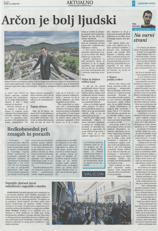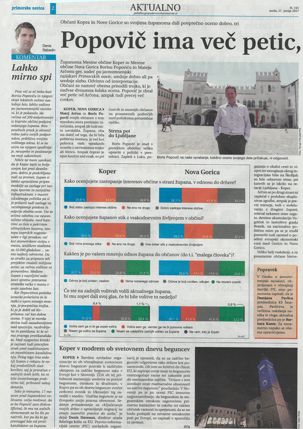 Kljub udarnim naslovom, ki na prvi pogled zavajajo bralce, nadroben pregled v torek in sredo objavljene ankete Primorskih novic o zadovoljstvu z delom županov Mestne občine Koper in Mestne občine Nova Gorica, postreže s podatki, ki kažejo, da so občanke in občani Mestne občine Koper, kljub temu, da je v tako veliki občini vedno ostaja še veliko izzivov za uresničiti, nadpovprečno zadovoljni s številnimi razvojnimi področji in delom župana Borisa Popoviča.