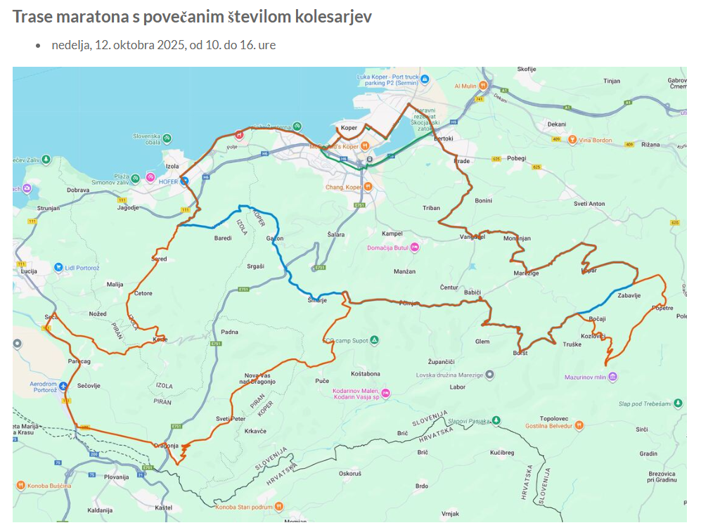 Ta konec tedna bo Koper znova dihal s kolesarstvom – prihaja tradicionalni Istrski kolesarski maraton, največji rekreativni kolesarski dogodek v slovenski Istri, ki vsako leto privabi številne ljubitelje kolesarjenja, narave in dobre družbe. Nedeljski maraton prinaša tudi zapore nekaterih cest v mestnem jedru in na podeželju. Seznam zapor in natančne ure so objavljeni na spletni strani organizatorja.