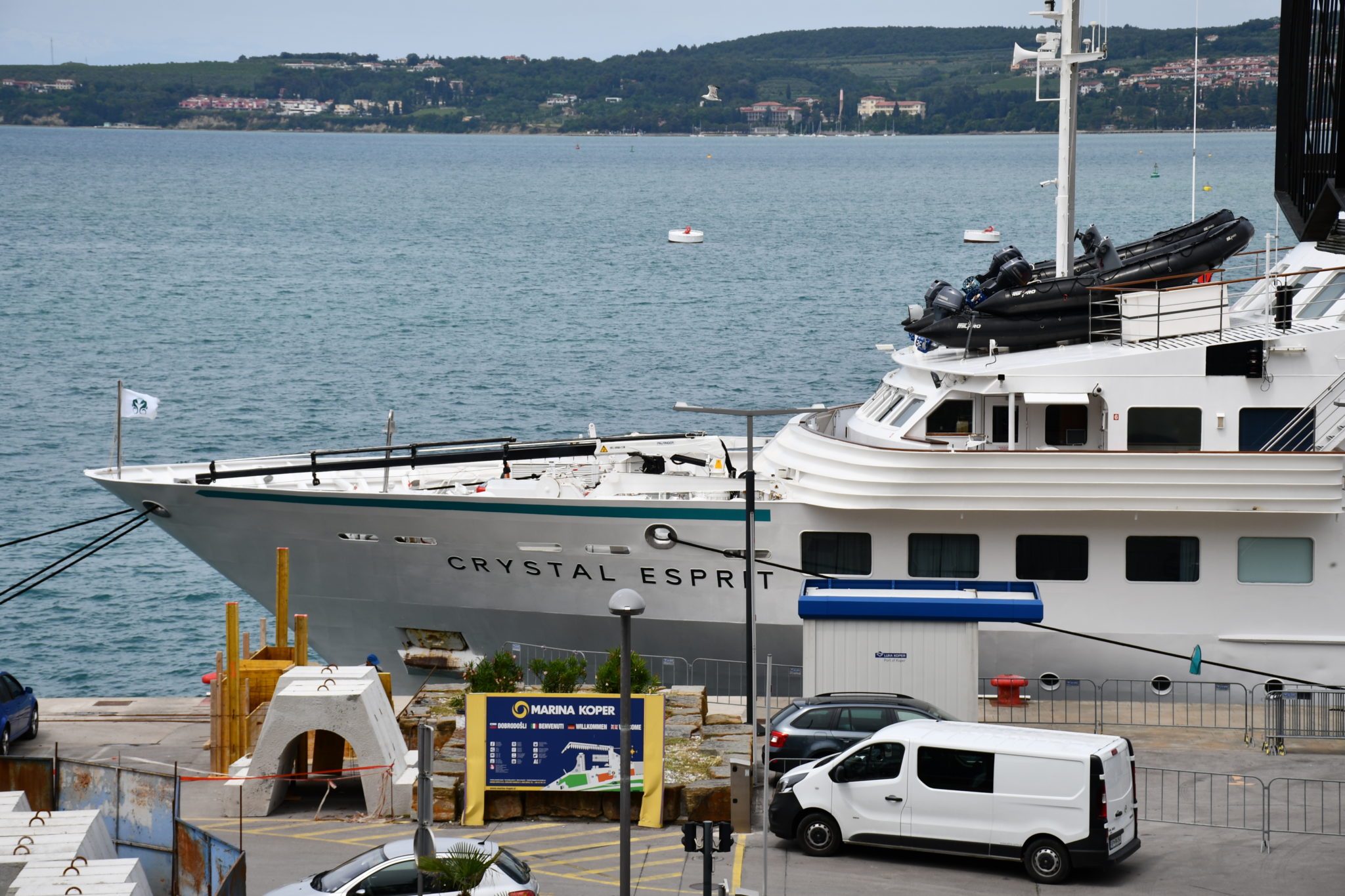 Zaradi slabih vremenskih razmer v dopoldanskem času se je luksuzna super jahta Crystal Esprit, ki je bila sicer namenjena v Piran, privezala na koprskem potniškem terminalu.