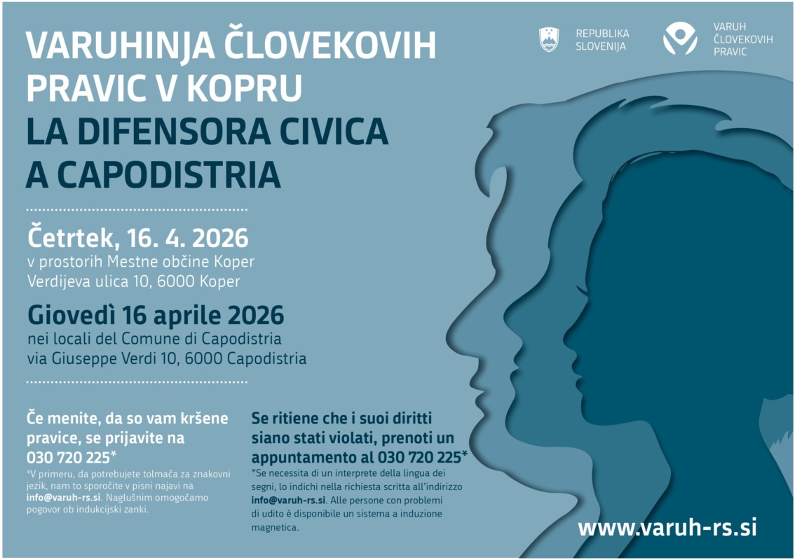 Varuhinja človekovih pravic dr. Simona Drenik Bavdek bo v četrtek, 16. aprila 2026, poslovala v Kopru. V prostorih Mestne občine Koper bo s sodelavkami in sodelavci za pogovor in svetovanje na voljo vsem prebivalkam in prebivalcem občine ter širše regije, ki menijo, da so jim bile kršene človekove pravice s strani državnih organov, organov lokalnih skupnosti ali nosilcev javnih pooblastil.
